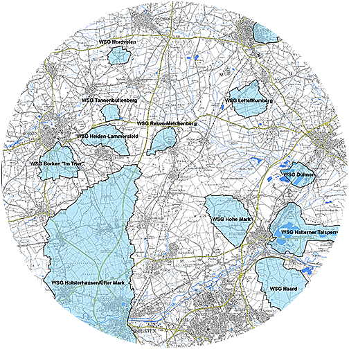Im Ablagerungsgebiet der Halterner Sande und deren Randgebiet sind 12 Wasserschutzgebiete zugunsten der öffentlichen Trinkwasserversorgung ausgewiesen worden.
